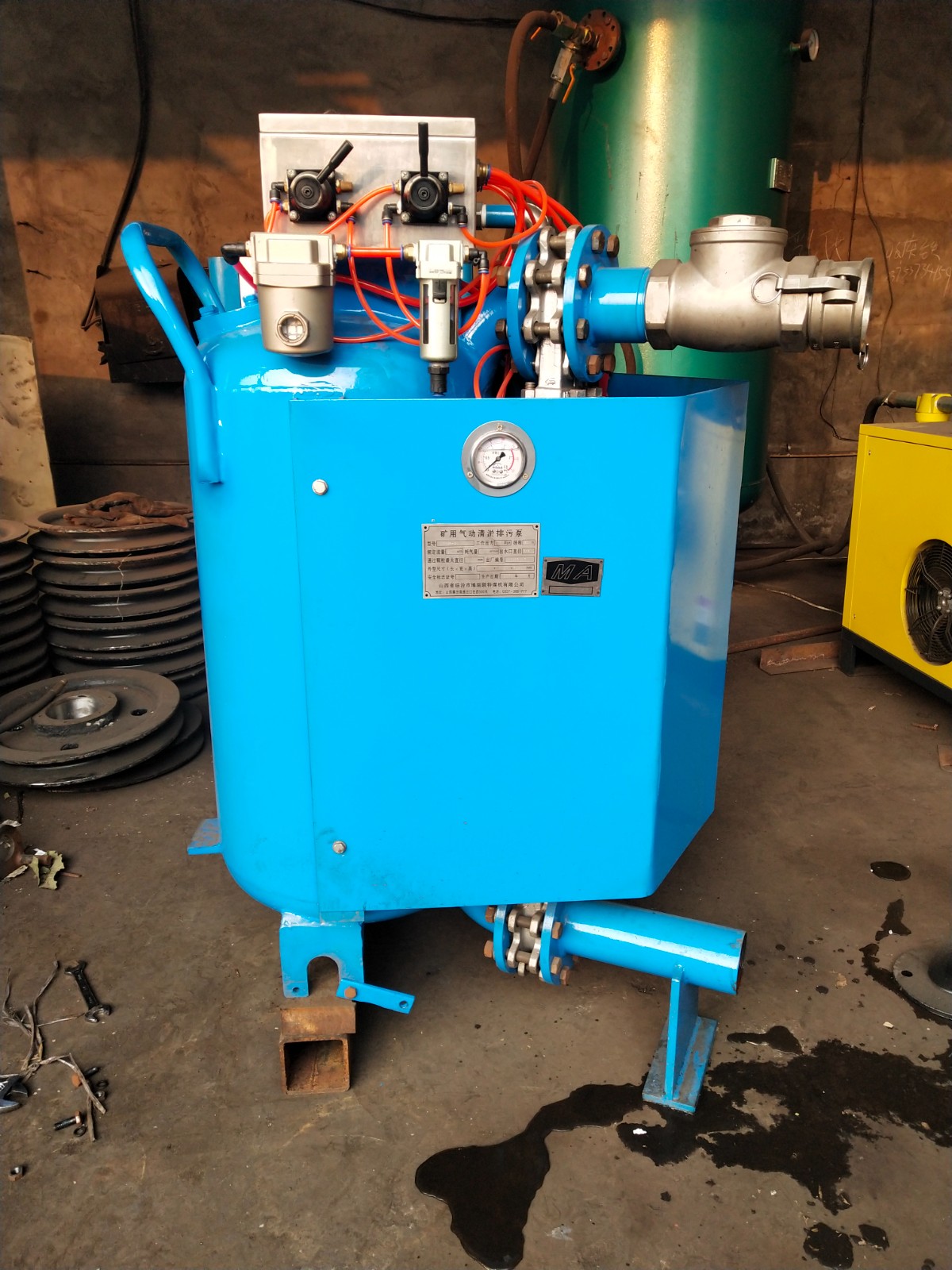 QYF32-20型矿用气动清淤排污泵,使用压缩空气为动力源,该产品适用于煤矿井下水仓及固定皮带机机尾沉淀煤泥的清理。与普通污水泵有着本质的区别,它可吸取颗粒≤25mm的小煤块和煤泥水混合物。